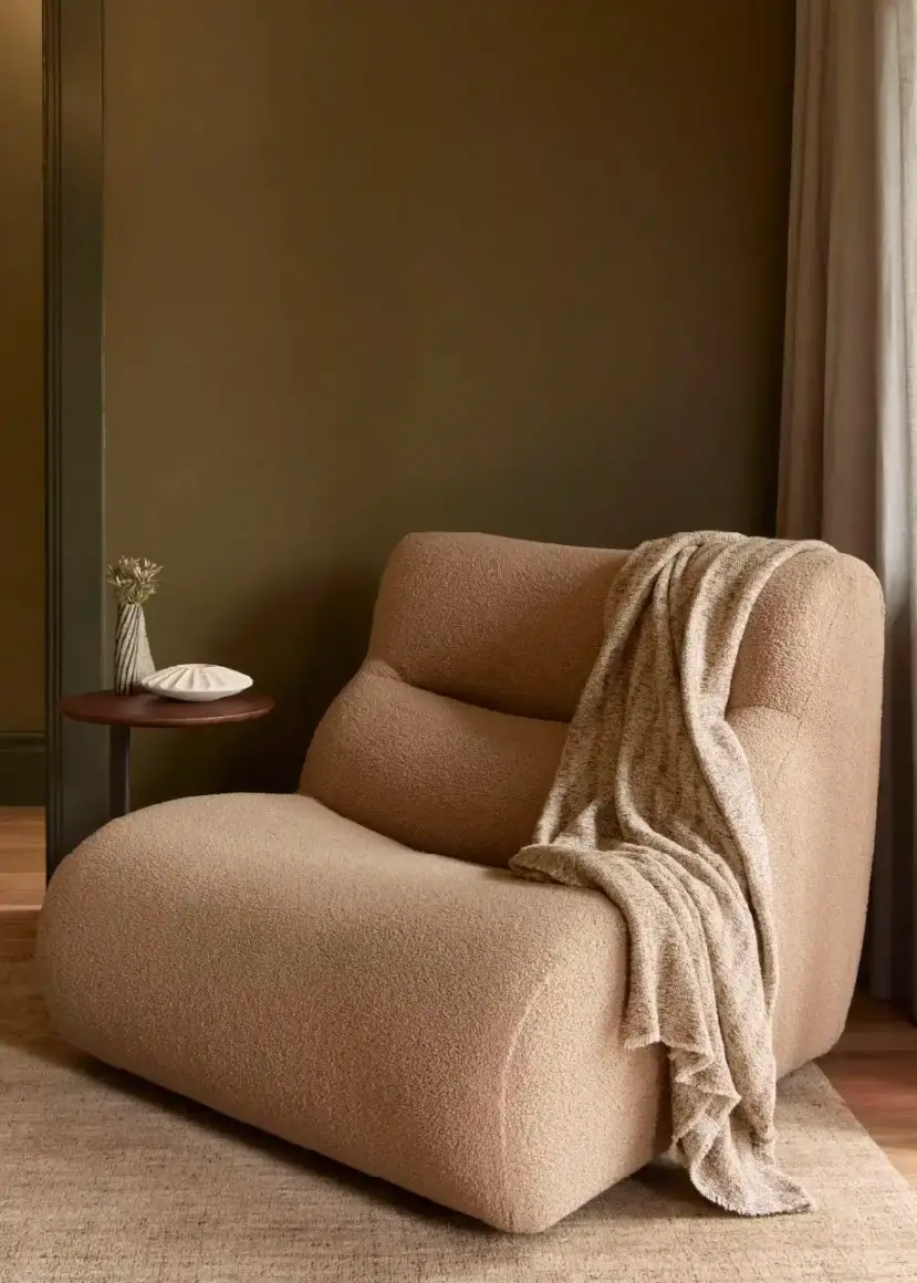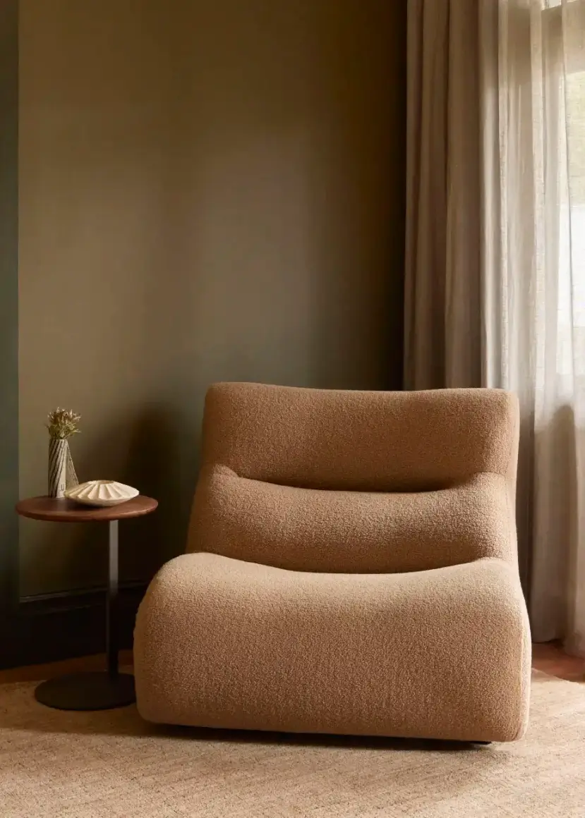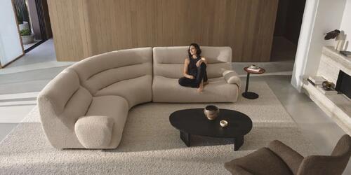 Its upright backrest, layered cushioning, and generous proportions evoke the bold 1970s silhouettes, softened by refined detailing, curves, and modern textures. The elevated backrest offers sculptural presence and supportive comfort, with tailored upholstery, optional armrests, and premium, removable fabrics for personalization across diverse interiors.