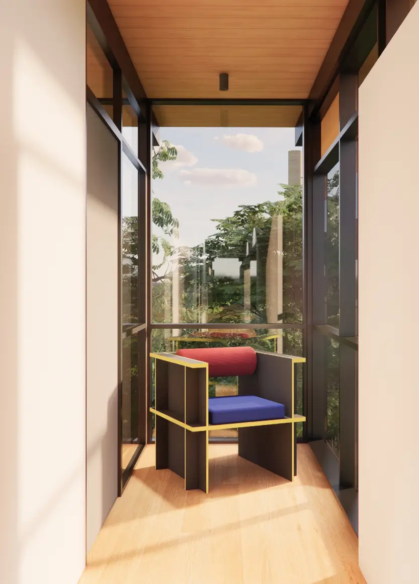612 utilizes everyday materials and reductive sculptural concepts to achieve intellectual yet functional results. Baltic birch plywood comprises the intersecting planes of the chair. Plywood surfaces are sprayed with a satin catalyzed lacquer. A variety of upholstery fabrics are envisioned for the chair with these submitted prototypes employing canvas.