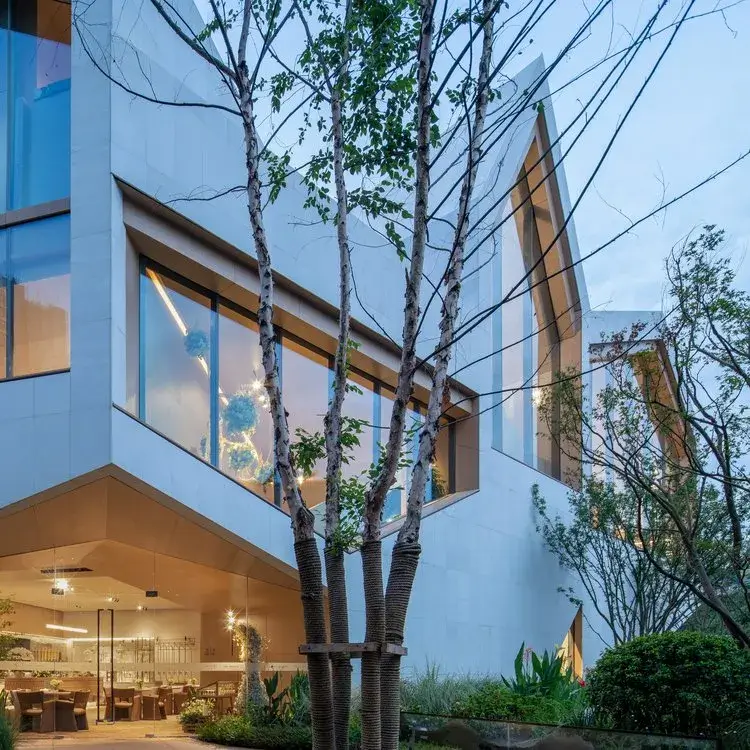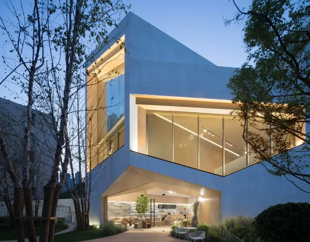 The reinforced concrete structure conforms to the logic of the internal spaces, and the facade uses white granite stone and glass curtain walls to express the overall skeleton and the folded interior.
