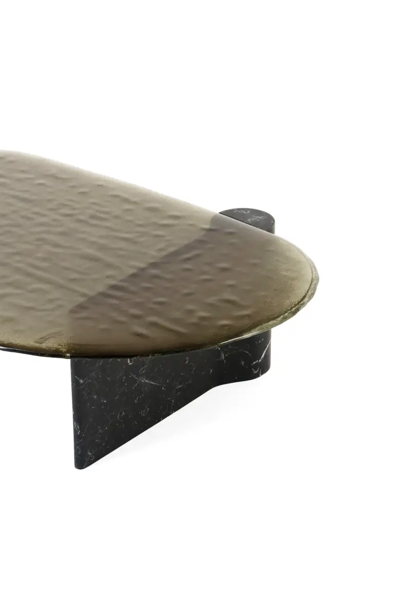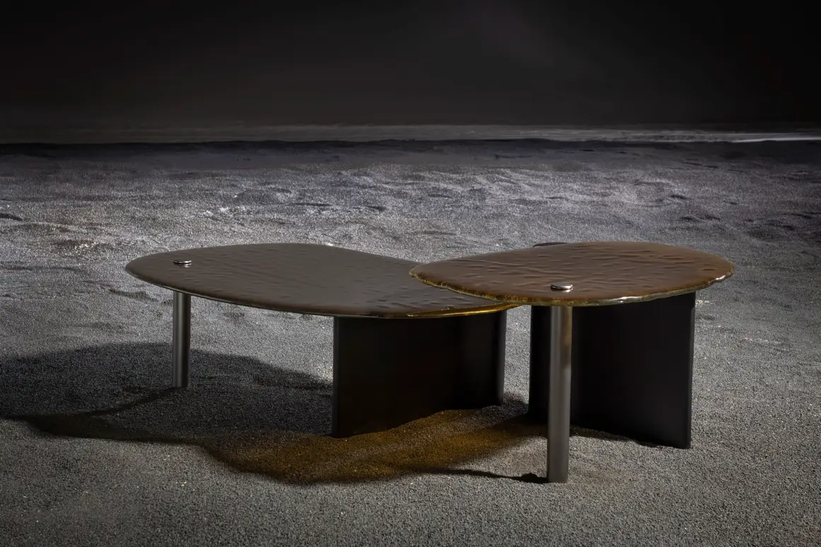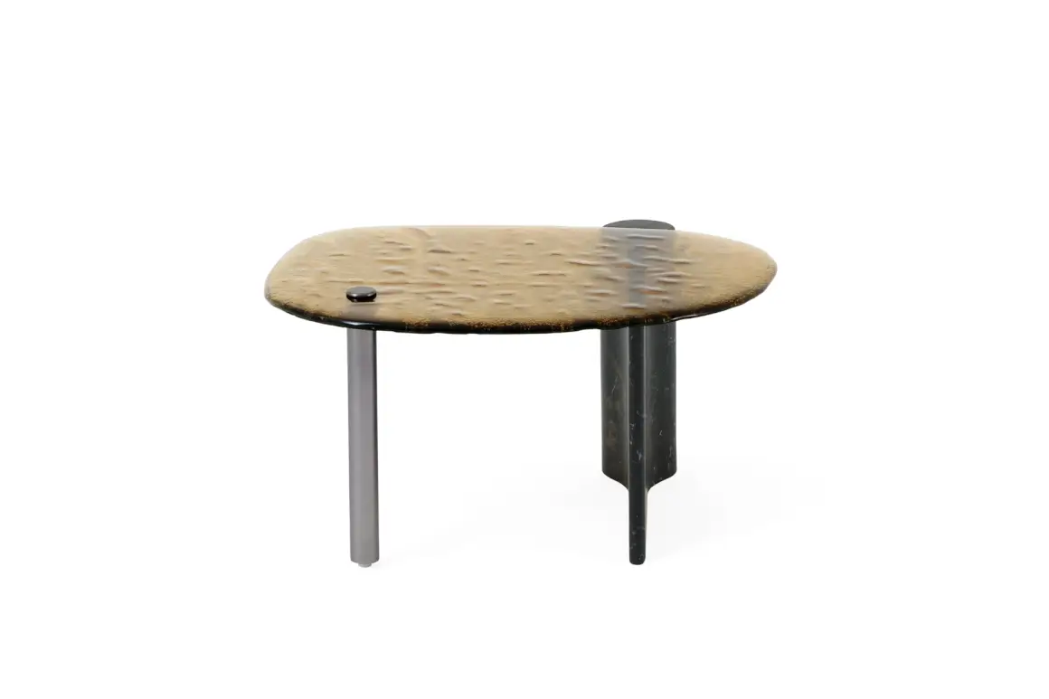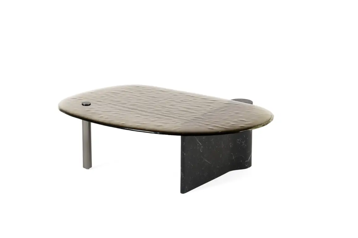 The Boyang coffee table has a colored glass top, it is a handmade and very special work that looks like the movement of water.