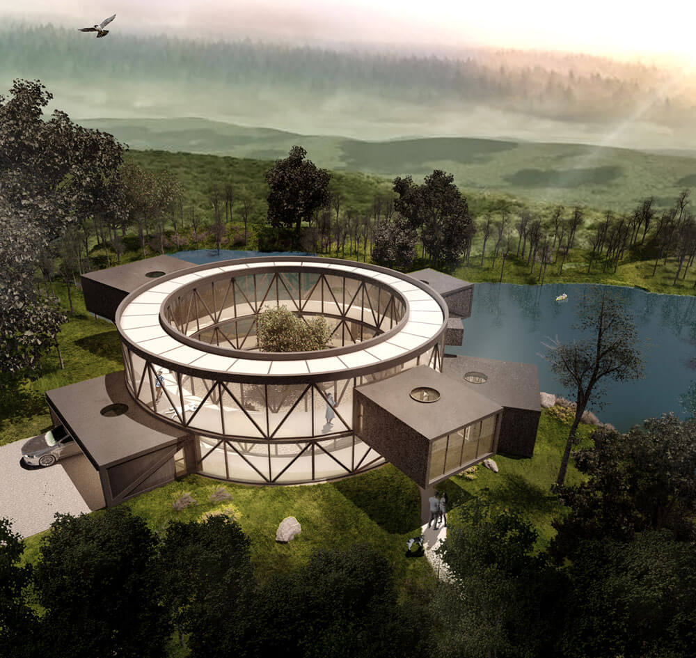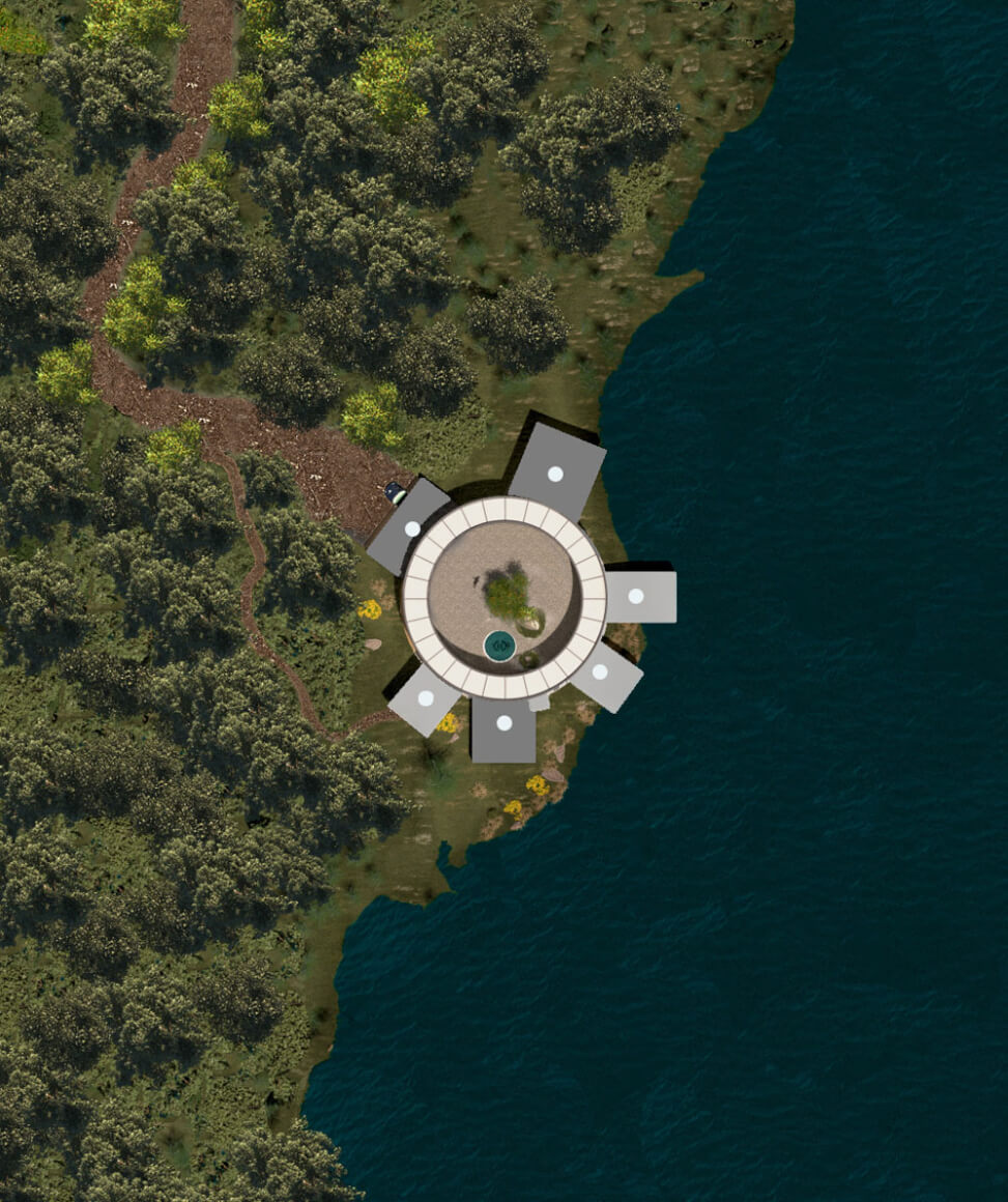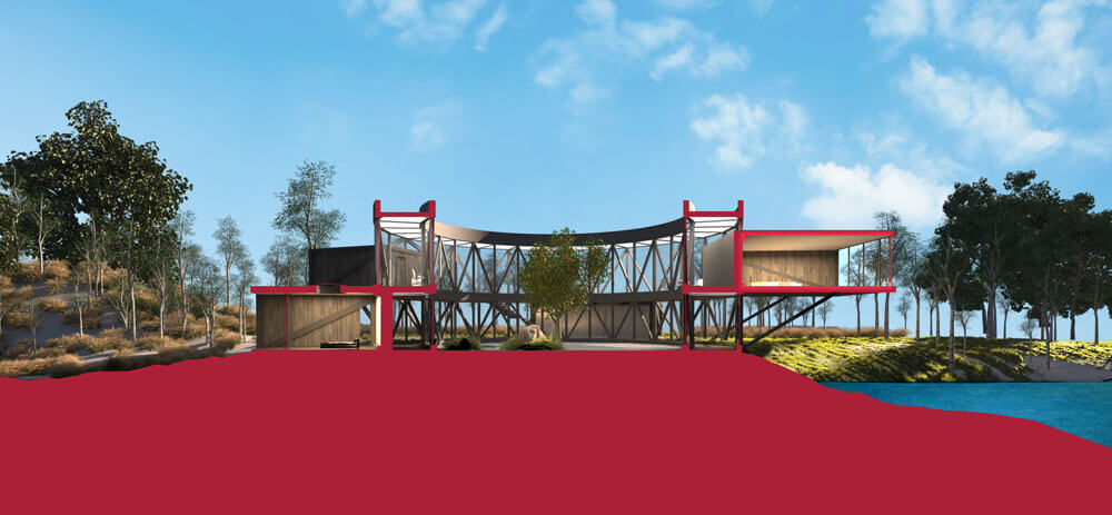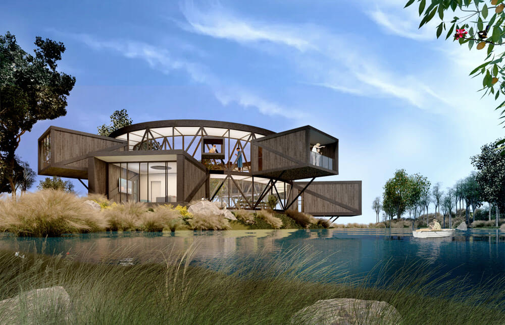 On the shoreline of the 592-acre Spirit Lake, Poon Design proposes a daring reinterpretation of the traditional courtyard house design. The courtyard concept is believed to have originated in Jordan Valley, circa 6400 BC, then spread throughout Europe, Middle East, and Asia, arriving to the United States in the 1800s. Historically, this courtyard design was primarily an introverted idea with the home’s functions around a central outdoor area.