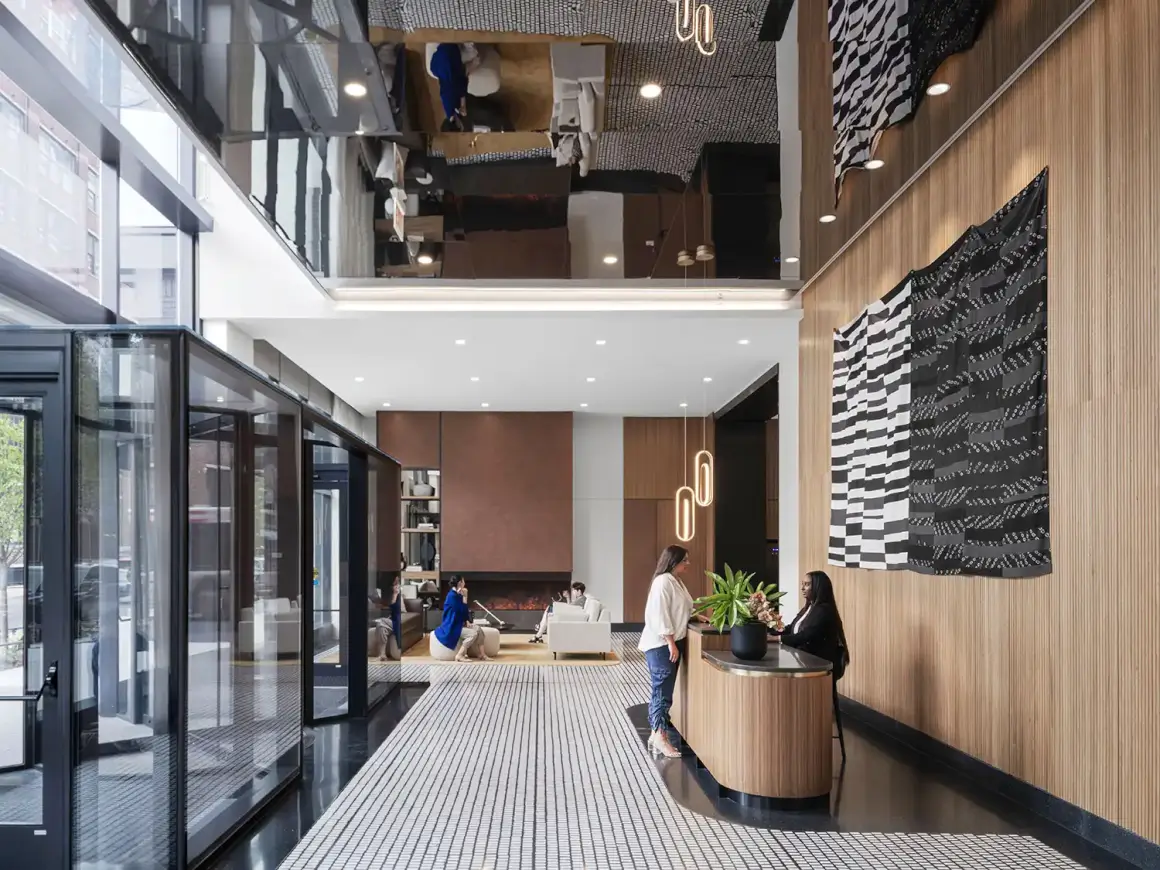 On the ground floor, additional amenities include a 2,200-square-foot game room, which houses a bar, arcade games and upscale golf simulator, along with a 5,000-square-foot co-working facility, a dog park with dog spa, 24-hour concierge service and extensive bike storage. A curated collection of contemporary art is also integrated throughout the building.