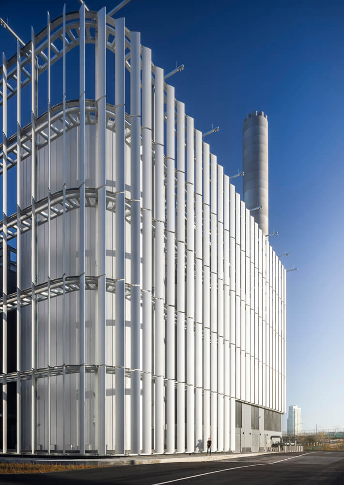 A wrapper of anodized aluminum metal fins forms a screen around the facility, with petal-like elements set at varying degrees of openness to reveal or conceal the various equipment areas within.