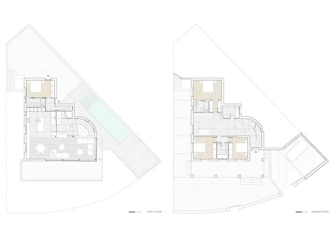 The project envisaged a new interior layout, particularly on the first and second floors, which now revolve around a new interior staircase that leads up to the second-floor terrace, home to a new swimming pool that serves as a dividing line while engaging with the surrounding landscape.