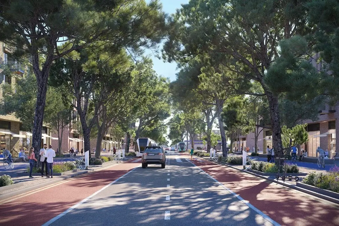 The existing highway, Larnaca-Dhekelia Road, is transformed into a verdant and pedestrian-friendly street with new public amenities.