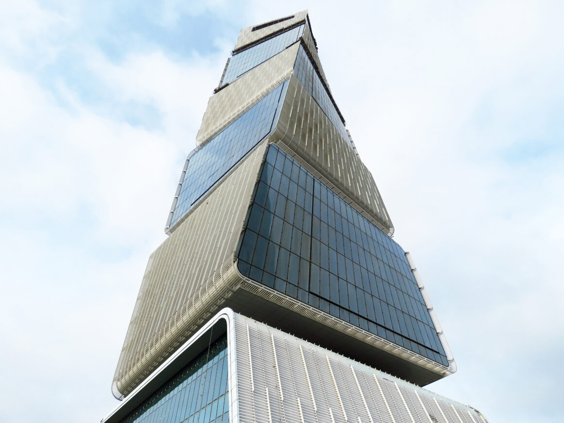 The geometric forms gradually taper and rotate a total of 36 degrees from the base to the top, optimizing solar orientation and allowing the tower to achieve ambitious energy efficiency goals.