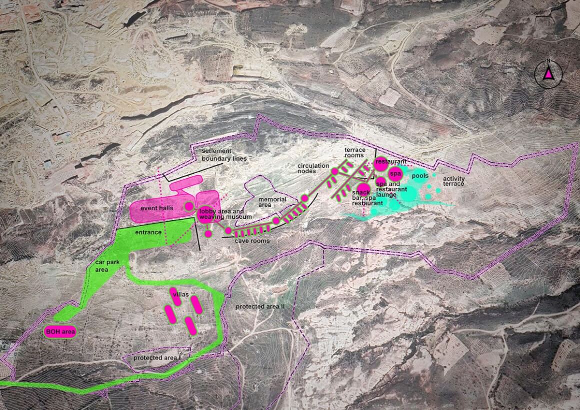 The project has been designed as three separate zones as allowed by rock carving (cave) construction.