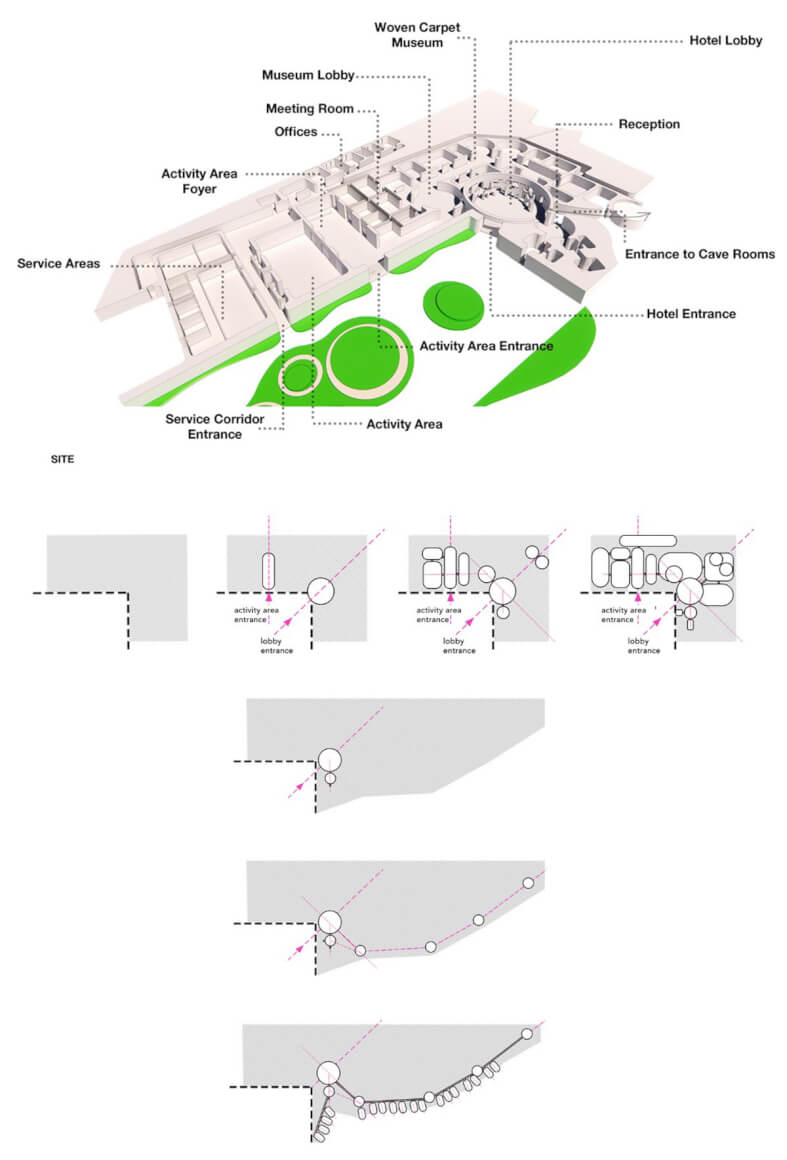 Cappadocia Spa Hotel intends to be a part of the “place” by using the physical and cultural data of the area’s geography and creating its “own context” with the unique texture and fiction it has created within itself. The design concept draws on the idea of destroying the borders between the natural and the new and establishing a synthesis in between.