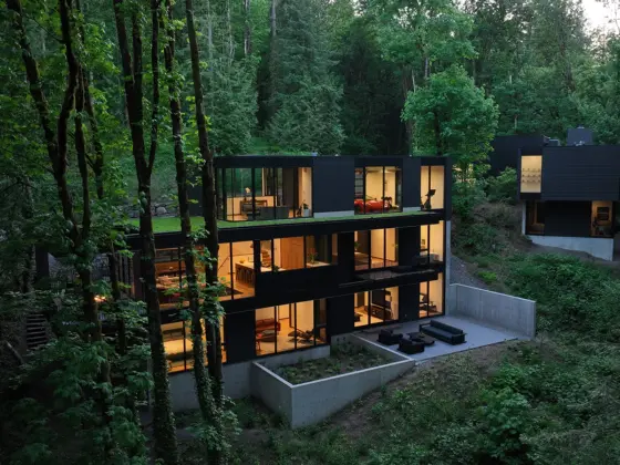 The house’s exterior is resided using Shou Sugi Ban Accoya barn wood vertical siding.