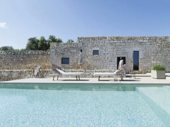 The south-facing main façade offers protection against intense heat, while the west-facing rooms provide stunning views of the sea and surrounding nature.