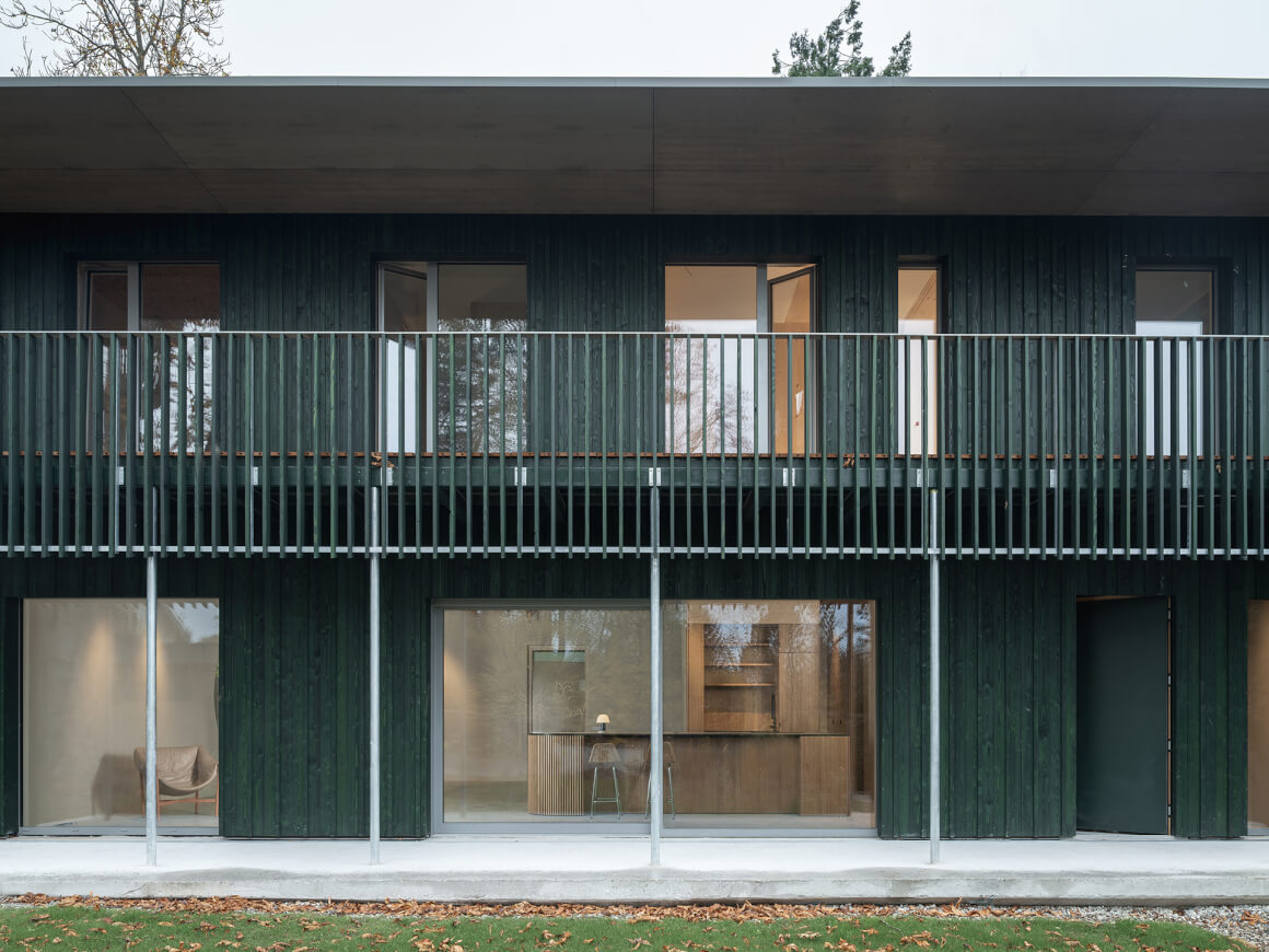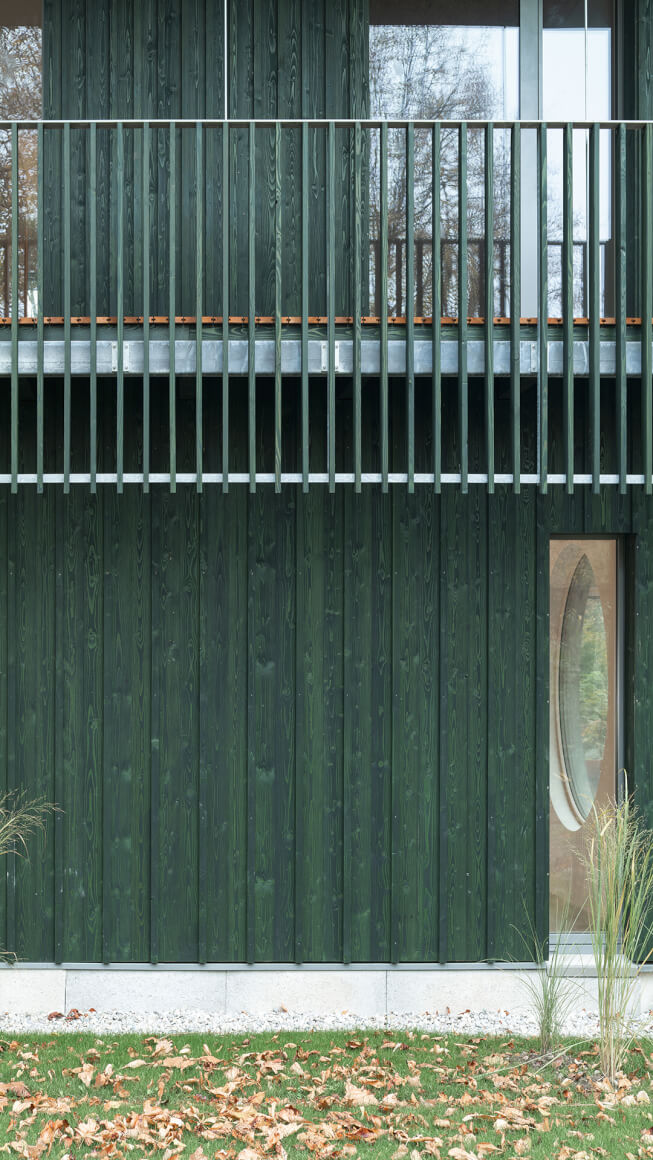 A central design approach is the use of organic, local and recycled building materials – above all wood for the supporting structure, the insulation, the interior fittings and the lush green façade. Architecture, interior design and an open space design that supports biodiversity with native meadow flowers, shrubs and trees appear as a holistic unit. The green roof (combined with a water cistern), the lawn and deadwood areas also provide spaces for insects and thus promote the protection of biodiversity.