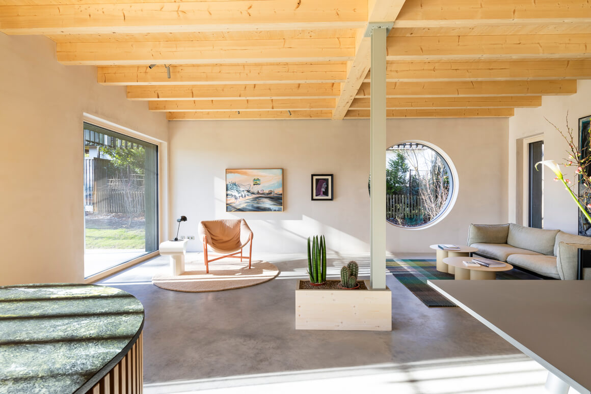 The interior is characterized by natural materials, such as clay plaster cladding and recycled and sustainability-certified furniture. The idea of reuse was also taken into consideration in the design of the interior spaces. The freely designed floor plan offers flexible use and can also be divided into two residential units in the future.