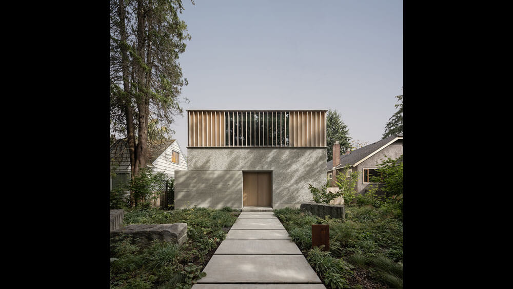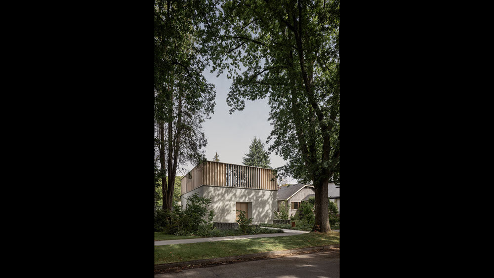 The material palette is limited but expressive. Below, rough stucco catches light in shifting textures. Above, a cedar filigree forms a lantern-like screen that mediates views and enclosure. Board-formed concrete elements assert a tactile presence, slipping past the envelope to frame views, define thresholds, and quietly disrupt symmetry.