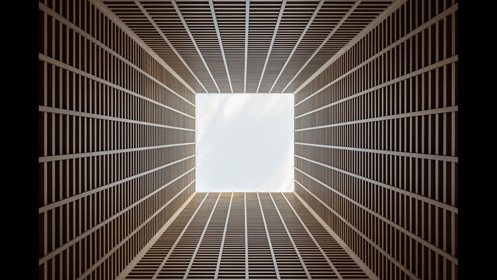 At its core is a central void — a clearing in the mass, like a break in the forest canopy — where light pools and filters into surrounding rooms. This space serves as both organizing principle and atmospheric anchor. Around it, rooms arrange themselves with informality, gradually revealing an underlying nine-square grid: a quiet structure felt more than seen.