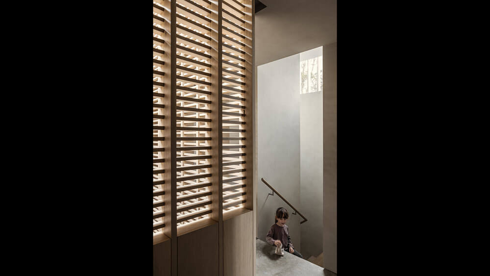 Upstairs, the stair dims, limewash deepens, and light filters through the wooden screen. The bedrooms are calm and veiled. A hidden tub room — windowless, lined in grey plaster, lit only from above — concludes the journey.