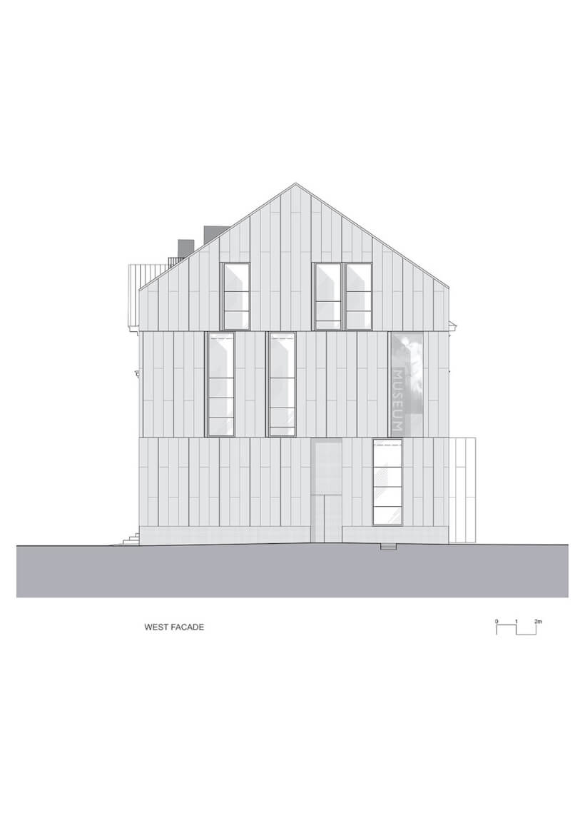 The designer, on purpose, relocated the entrance on the south-facing façade so that the museum would have an easily recognizable entrance on the ground floor for problem-free access by wheelchair users.