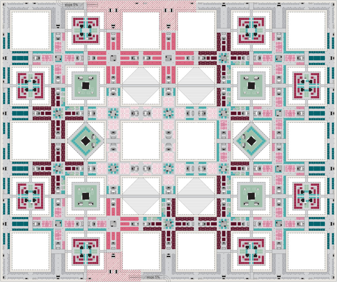 Reinier de Graaf/OMA and Buro Happold have devised a new concept for a health care district in Doha, Qatar that explores the “potential of modularity, prefabrication, and automation in relation to the rapid changes in medical science” on a 1.3 million-sqm plot with low cost, cross-shaped modular units that are prefabricated on site.