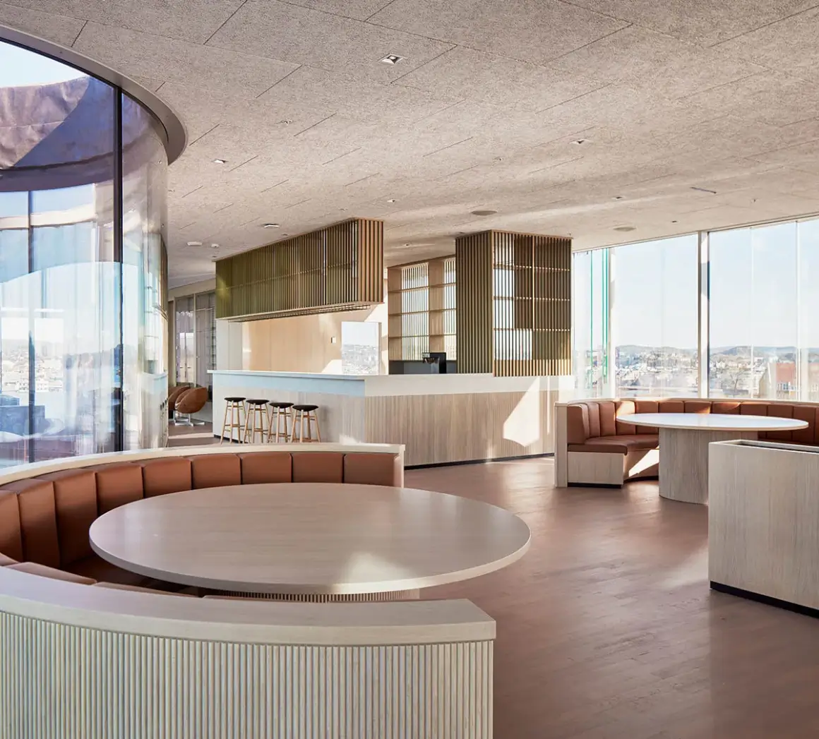 Additionally, there is a rooftop bar surrounded by terraces enclosed with glass cylinders, which replicate the building’s modulation and create the appearance of a large lighthouse.