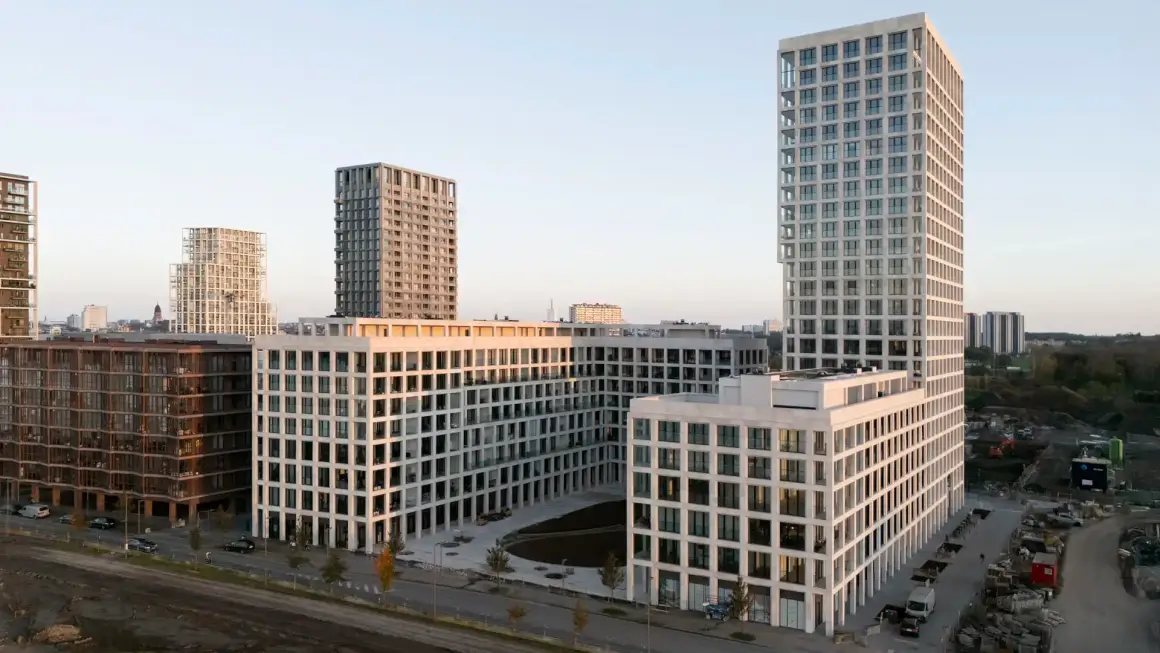 Nieuw Zuid, a significant new quarter west of Antwerp’s old town, is currently under development. This large-scale project includes nearly 2,000 apartments across 38 buildings, over 3,000 underground parking spots, and 12 hectares of green space. The master plan, designed by Studio Secchio-Viganò and landscape architect BAS Smets, positions the site alongside the River Schelde, creating one of Antwerp’s largest recent developments.