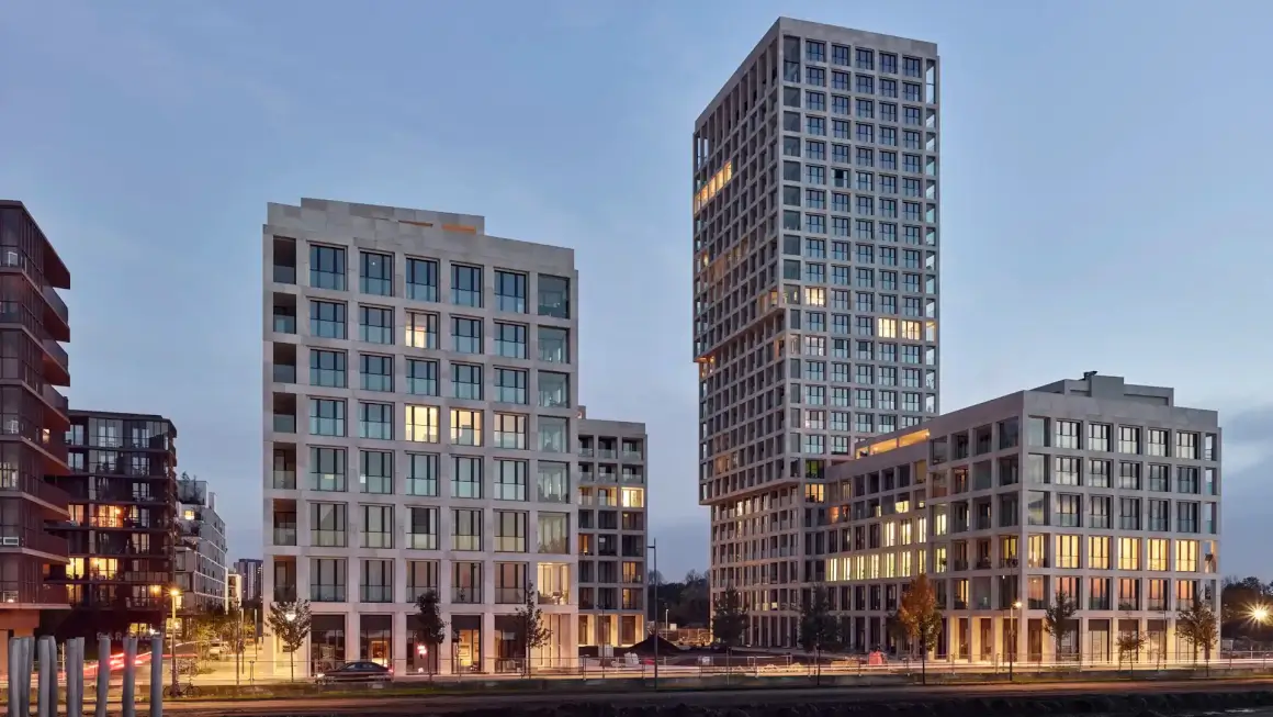 Architecturally, the two buildings share unity through a consistent sand-colored stone façade mesh and rhythmic facade elements that extend across 303 apartments. Each apartment includes a balcony and winter garden, integrating outdoor living into the design. The staggered facade adds a sculptural quality that distinguishes the project within Nieuw Zuid. The central plaza oriented toward the Schelde stands out with its open, public character.