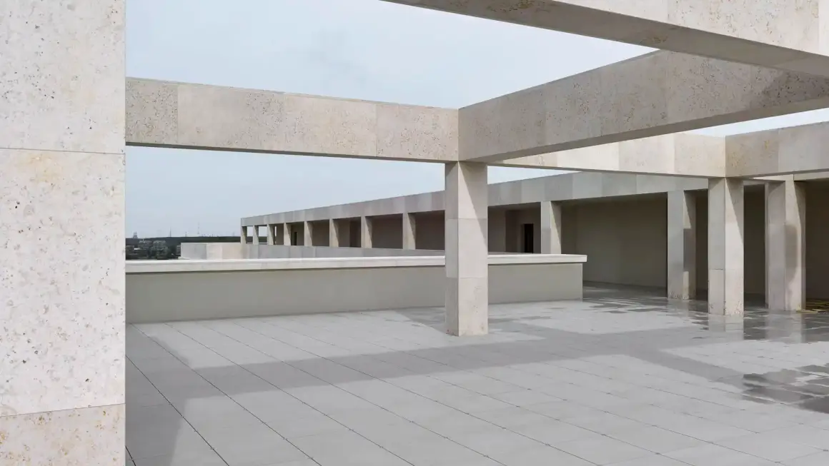 Max Dudler, collaborating with local Jaspers Eyers Architects, is designing a riverfront block at the heart of Nieuw Zuid. This block features two interconnected buildings: an L-shaped structure with cascading leafy terraces inspired by the Hanging Gardens of Babylon, and an 80-meter tower resembling a reversed staircase rising toward the city center. Together, they form a sculptural whole framing a central square that opens to the river, blending public space with privacy. The layout enables residents to engage visually and socially, similar to an amphitheater, where interaction occurs across the buildings and outward to the city and river.