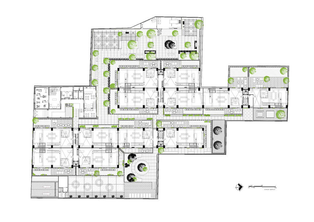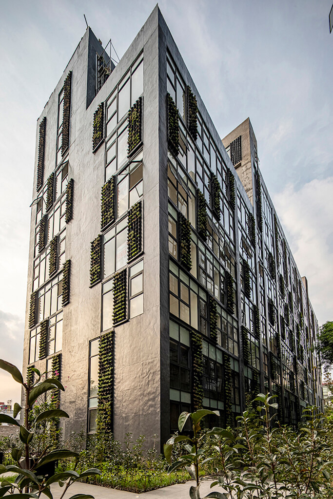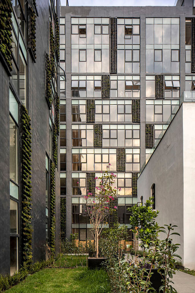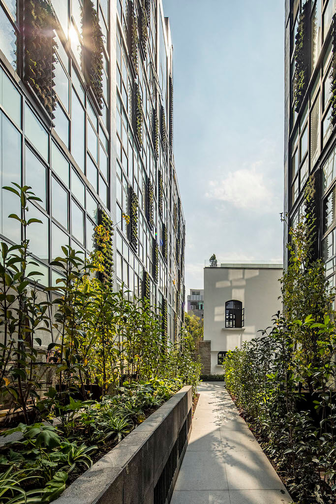 The architects wanted to generate a green footprint in the middle of the urbanized downtown area; for this reason, there are green areas on the ground floor, rooftops, and 9,200 m2 of green walls.