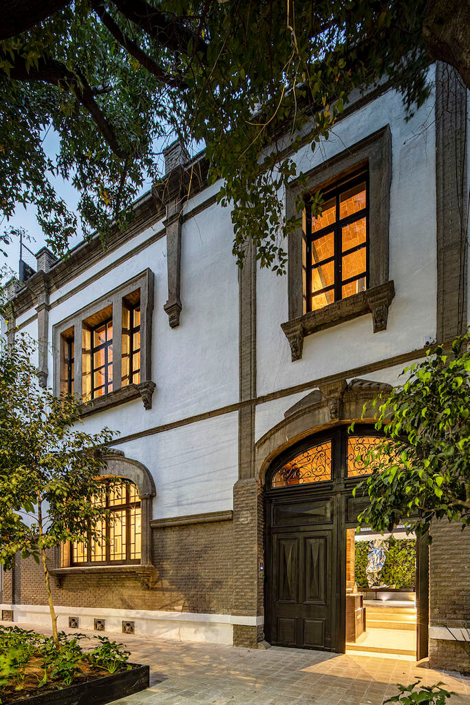 In the central courtyard, floors were preserved, and a reflecting water basin was added with a green wall and artwork.