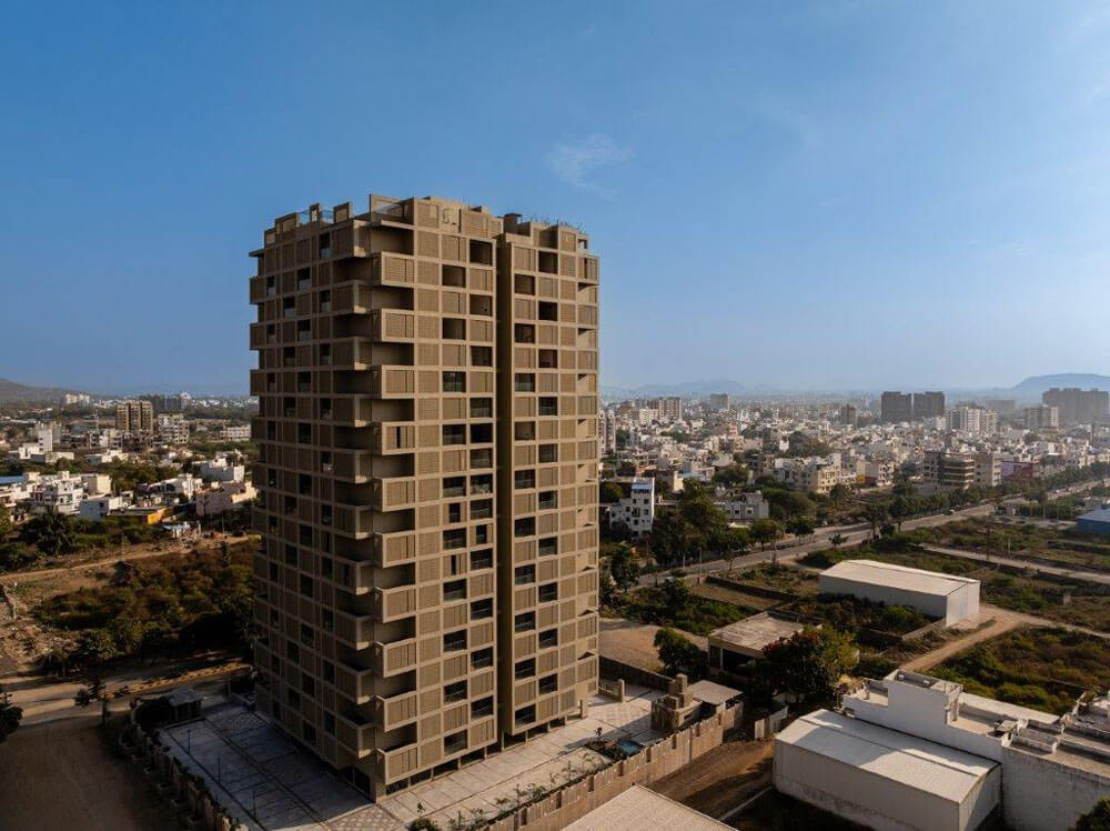 Screen 504 is a 21 storeyed apartment building with 78 apartments on a site of 3690 sqm located in Udaipur, Rajasthan, India , with a total constructed area of 20,000 sqm. At every level 4 apartments, each with 4 bedrooms & living spaces are planned in each quadrant to allow visibility & views of 2 adjacent sides of the surroundings with hills in the distance in all directions.