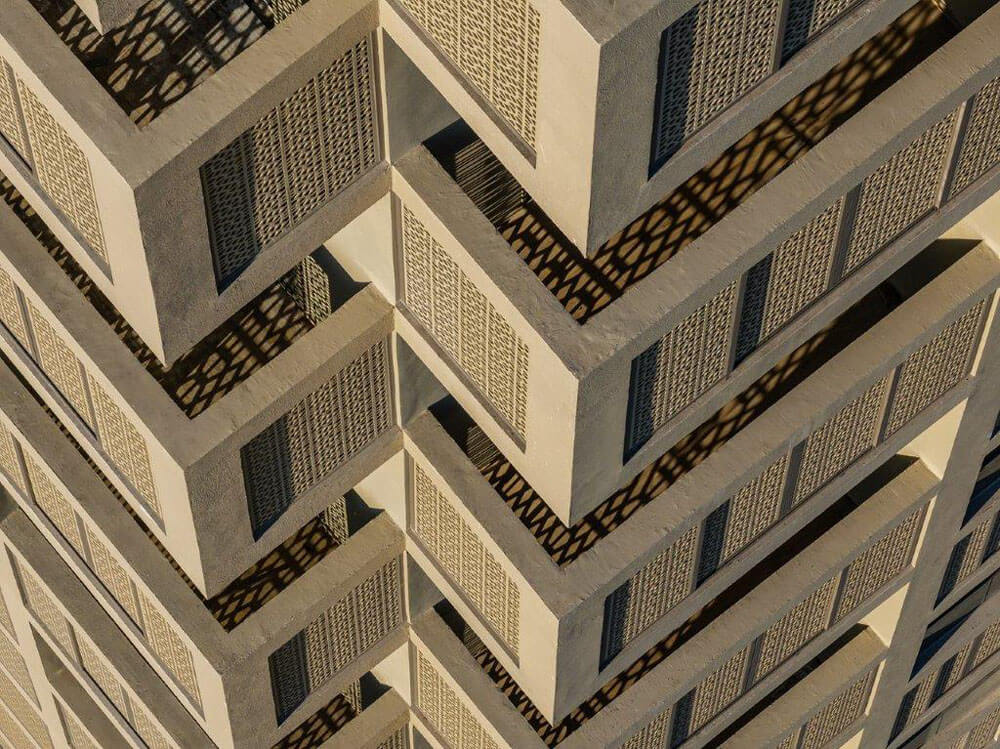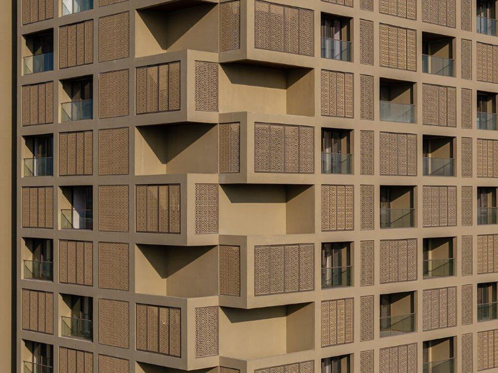 Some of these are open and some are screened with sliding screens which are perforated with a traditional pattern. The screened decks can be opened up partially. One of the decks in each apartment is 20 feet high . The residents have the option of using single height 10 feet high decks or 20 feet high decks which can be completely open, partially open or completely screened depending on the weather.