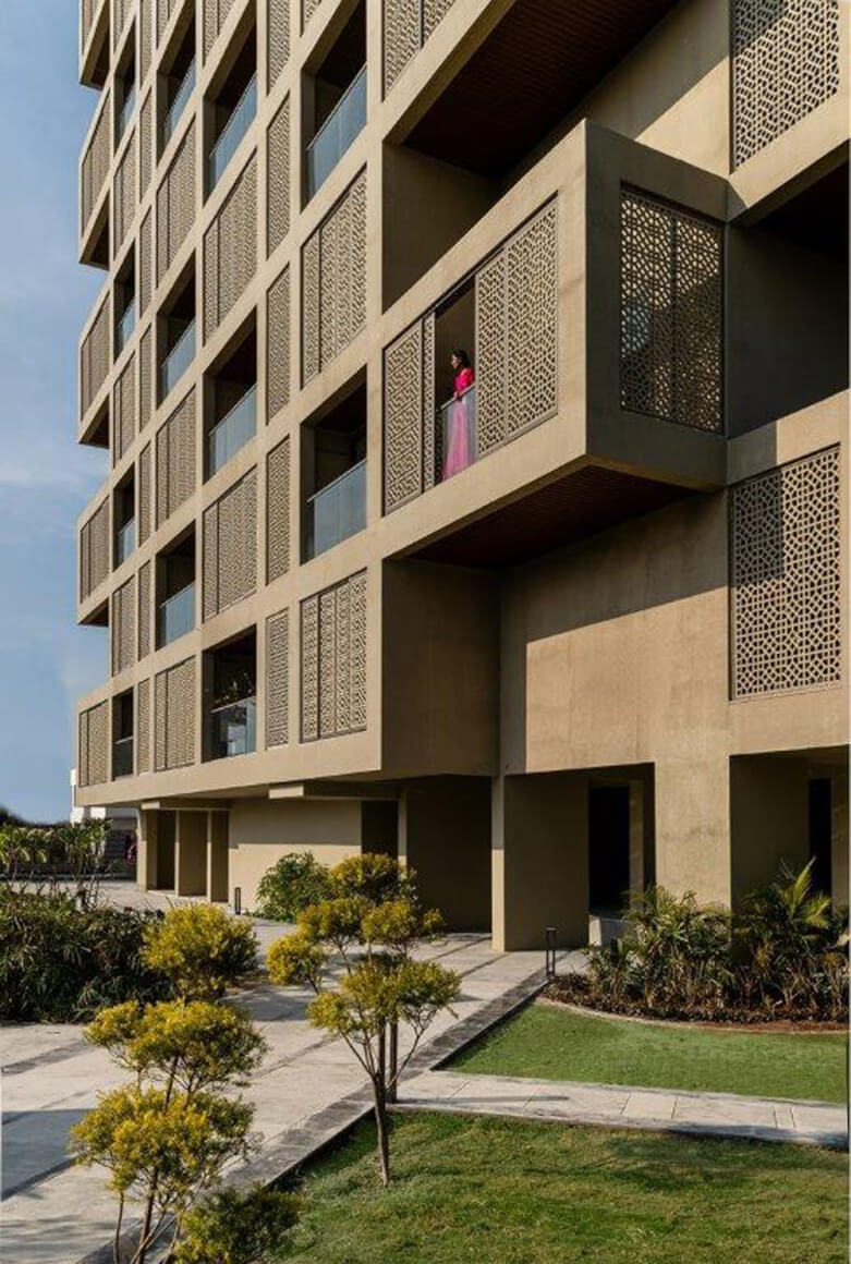 The entire perimeter of balconies & the roof top terraces are collectively drained to a rain water harvesting tank. In addition water is recycled & reused for gardening. These measures serve to reduce the need of external water supply. All the internal walls are made of fly ash brick. Locally sourced sandstone is used for the perimeter walls of the site and within the landscaped spaces. The entire labor for the construction was sourced locally. All these factors render the building sustainable.