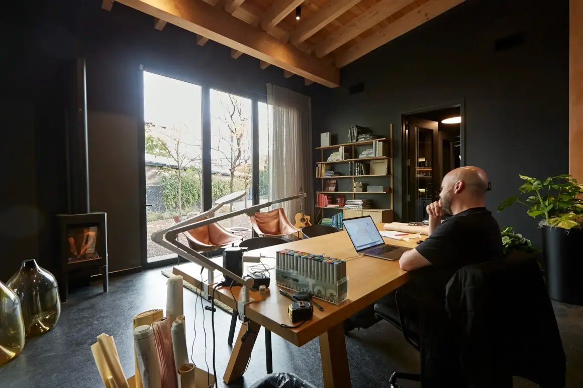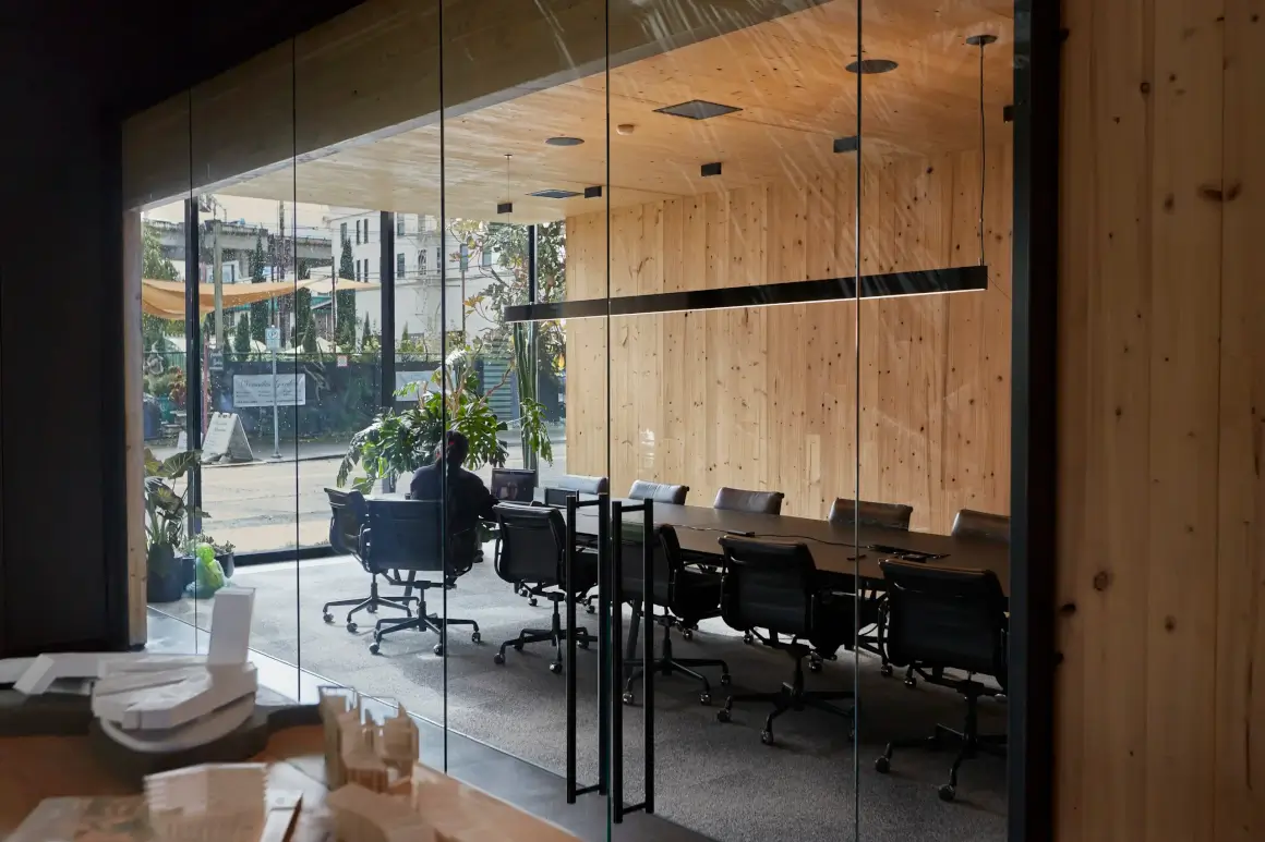 Inside, the venue features a full kitchen and dining room, listening lounge, 3D print space, and enhanced meeting and workspaces. The interiors feature an industrial aesthetic: exposed concrete floors, aluminum windows, and an exposed steel roof. Natural elements were introduced through the addition of conference rooms made with cross-laminated timber (CLT), wood cabinetry, and four 15-foot-tall trees in the large, open work area. Accessibility and energy systems were also part of the scope.