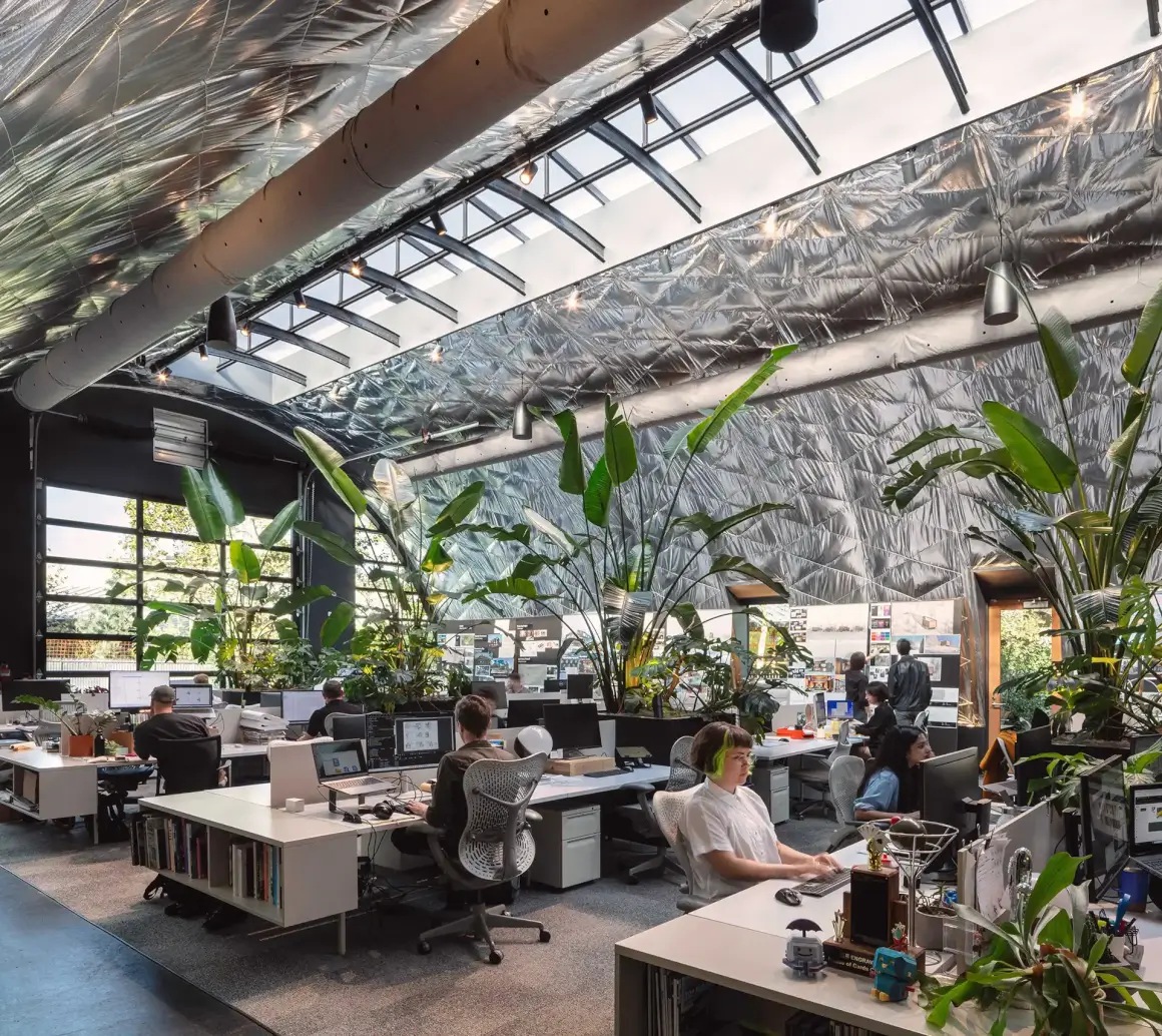 Visual and physical connections to the surrounding landscape and urban environment are enhanced through expansive new glazing on the north and south facades and four large 10-foot-by-10-foot operable window walls along the east. An existing 40-foot-long zipper-like skylight running along the central ridge of the easternmost building was expanded to 60 feet to bring sunlight deep within the building to work areas.