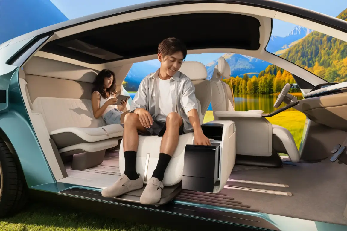The design also features unique outdoor camping integration, allowing seats to swivel 90 degrees and combine with the console, seamlessly connecting the interior space with the outdoors.