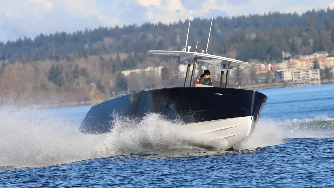 The Z11’s exterior hull, by designer Patrick Banfield, is also groundbreaking. Rather than having long strakes, the Z11’s hull form is shaped more like a high-performance sailboat. This design reduces wetted surface area and drag, increasing the boat’s range.
