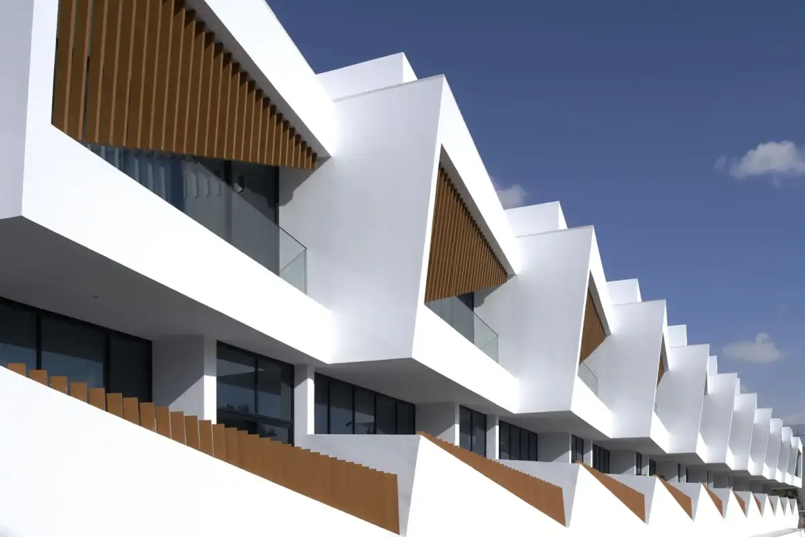 The other half of the ground floor features 25 two and three-bedroom townhouses, each with a cozy front yard and a larger back garden with direct access to the plaza. The first floor boasts 8 spacious apartments, ranging from one to three bedrooms, offering smaller yet truly comfortable living spaces. Deep balconies provide privacy and sun shading, creating a serene and enjoyable environment. Specially designed vertical louvres adorn the façade, striking a balance between shade and natural light, while minimizing energy consumption for air conditioning.