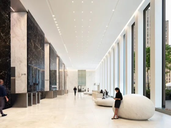 The façade elegantly showcases the architect’s biophilic design vision by maximizing the use of natural materials and green landscaping throughout the interior and exterior of the building.