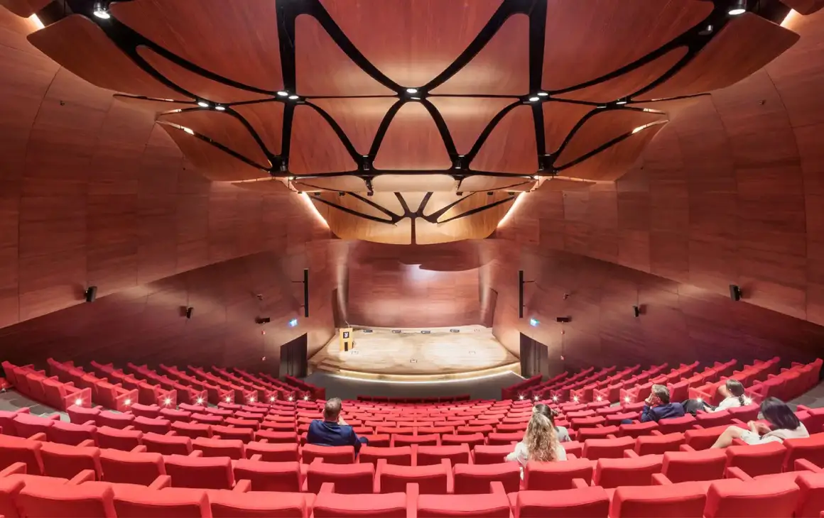 Throughout the building, high-quality local stone and wood details are incorporated, most notably in the auditorium, which is clad in double-curving panels of CNC milled, local limestone. Internally, the auditorium is lined with timber to create a sense of intimacy, the waving profile of the roof panels was modelled to improve acoustics.